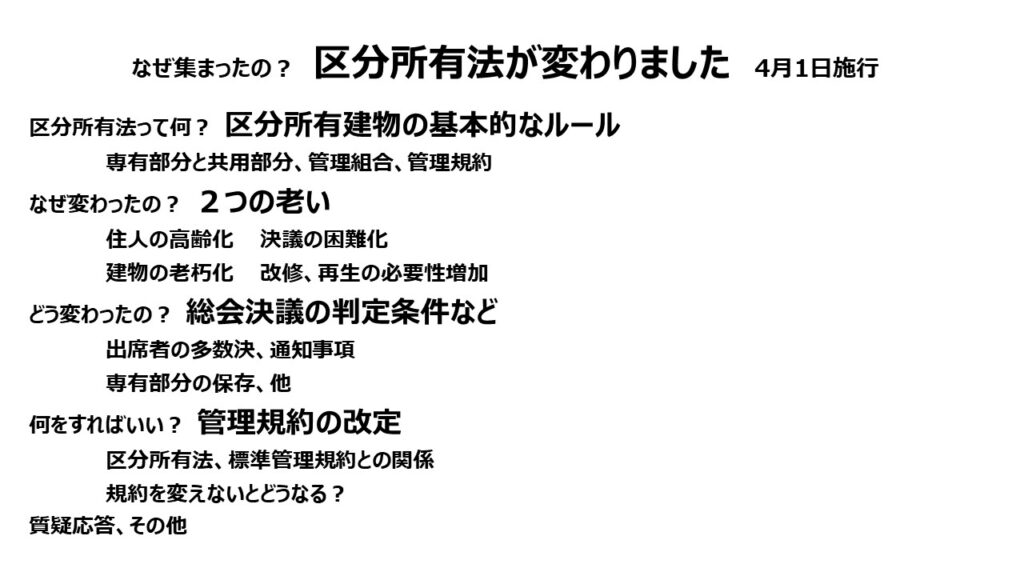 NEWS! 掲示板でご案内の通り、2026年3月21日(土)に法改正説明会がD棟談話室で開催されます。どうぞお集まりください。内容は下記参照。